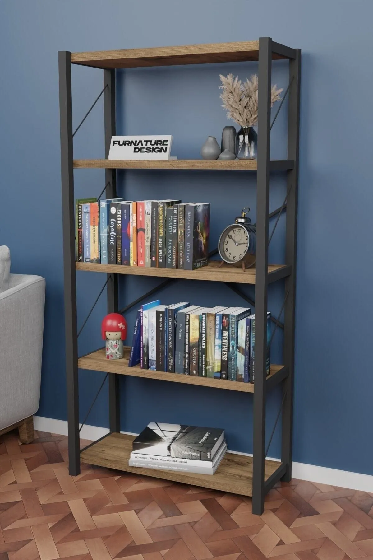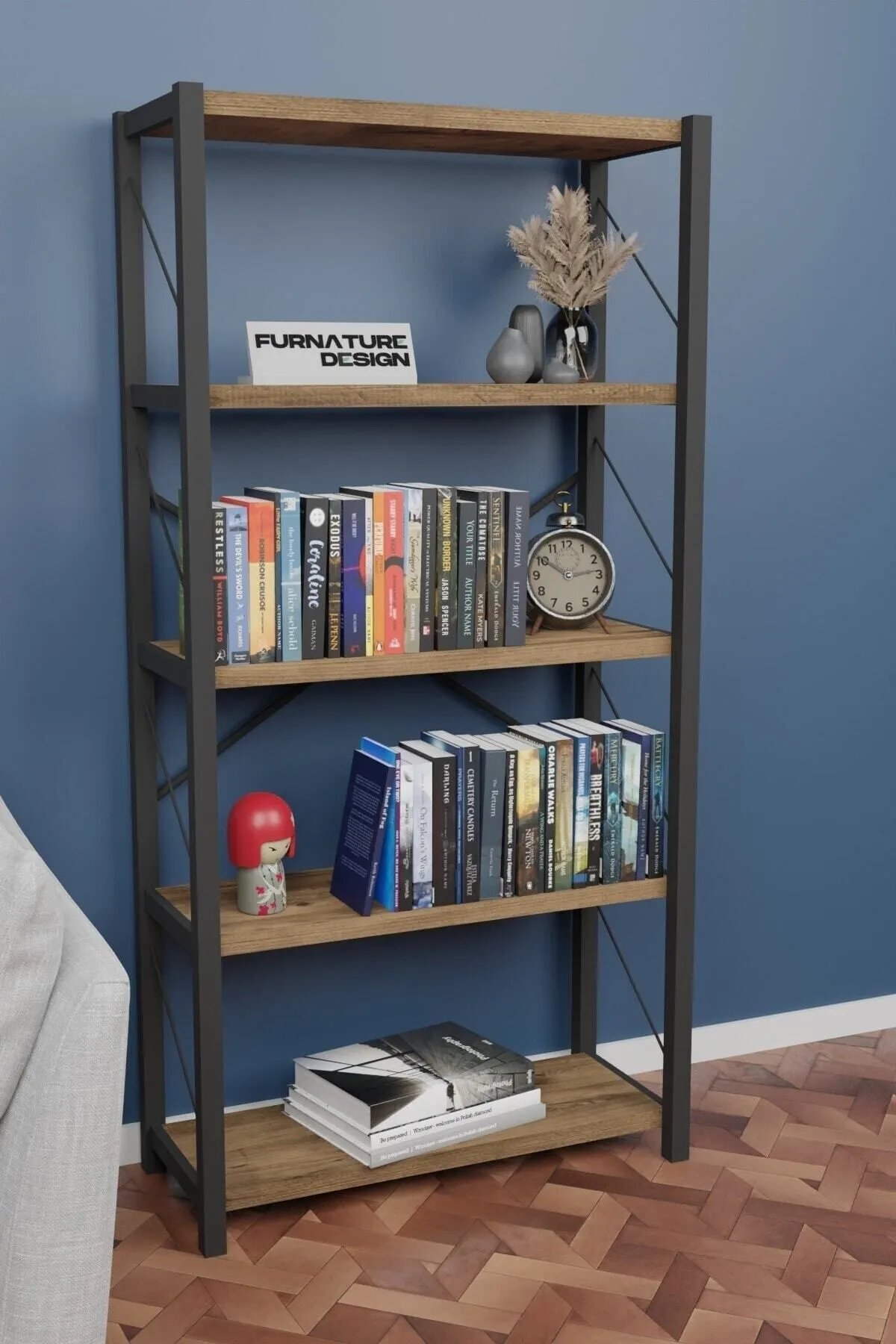 FurnatureDesign Metal Kitaplık 5 Raflı Dekoratif Kitaplık Atlantik Çam, şıklığı ve fonksiyonelliği bir arada sunan mükemmel bir tasarımdır. 🌟 5 geniş rafı ile kitaplarınızı, dekoratif objelerinizi ve diğer eşyalarınızı düzenli bir şekilde sergileyebilirsiniz. 🏡 Atlantik çam rengi, sıcak ve doğal bir atmosfer yaratırken, metal iskeleti modern ve dayanıklı bir yapı sağlar. 💪 Estetik tasarımı sayesinde evinizin her köşesinde zarif bir görünüm sunar. 📚 Hem evde hem ofiste kullanabileceğiniz bu şık kitaplık, mekanınıza şıklık katacak!