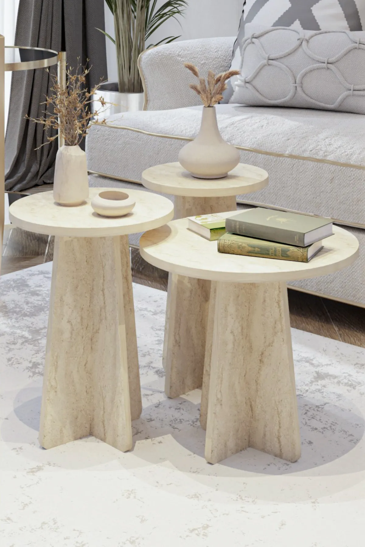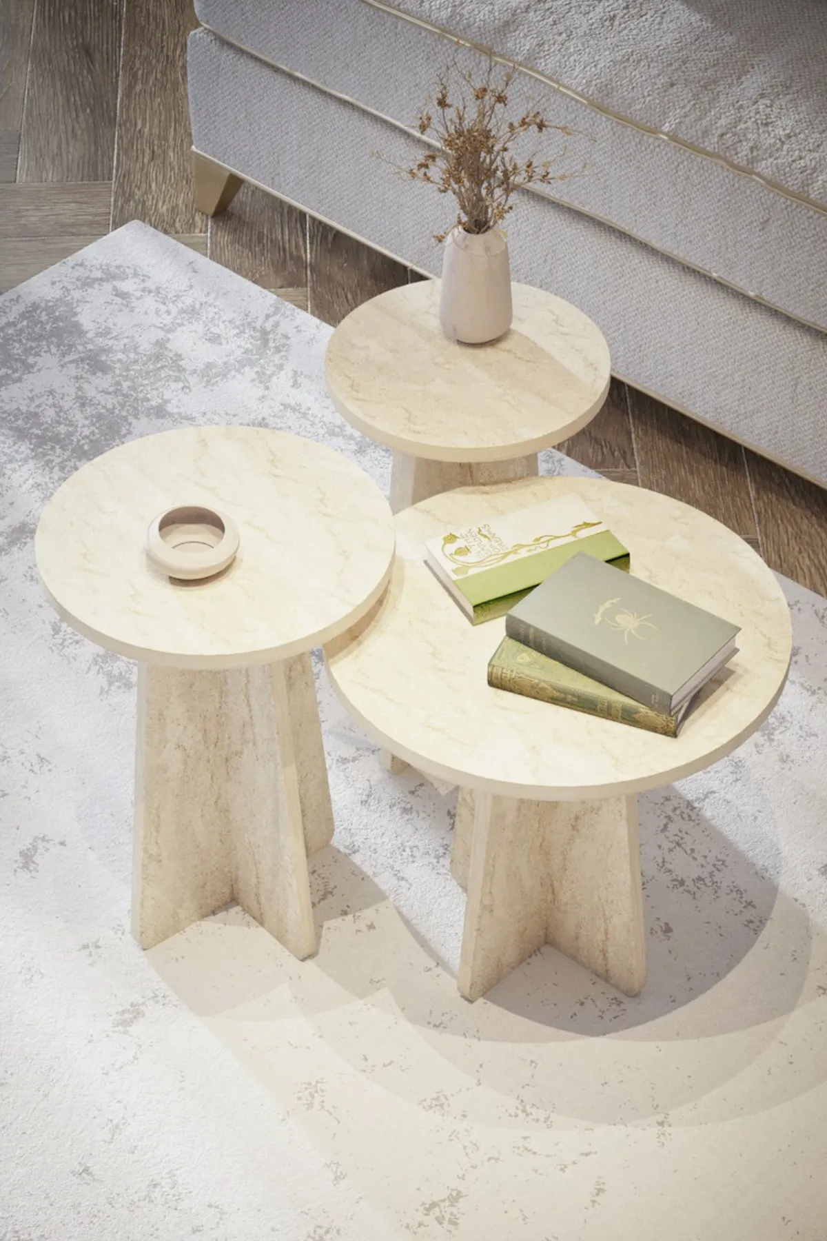 Iskandinav Mantar Sehpa 3 Lü Zigon Sehpa Takımı Yan Sehpa Orta Sehpa Traverten Mermer